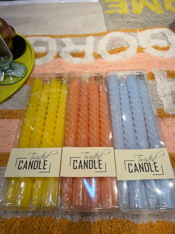 Set van 4 gedraaide kaarsen in leuke kleurtjes van Kersten. Deze vrolijke set kaarsen passen in elke standaard kandelaar. Verkrijgbaar in de kleuren: geel, oranje en lichtblauw. De kaarsen zijn ca. 26 cm hoog en made from PET recyclable.