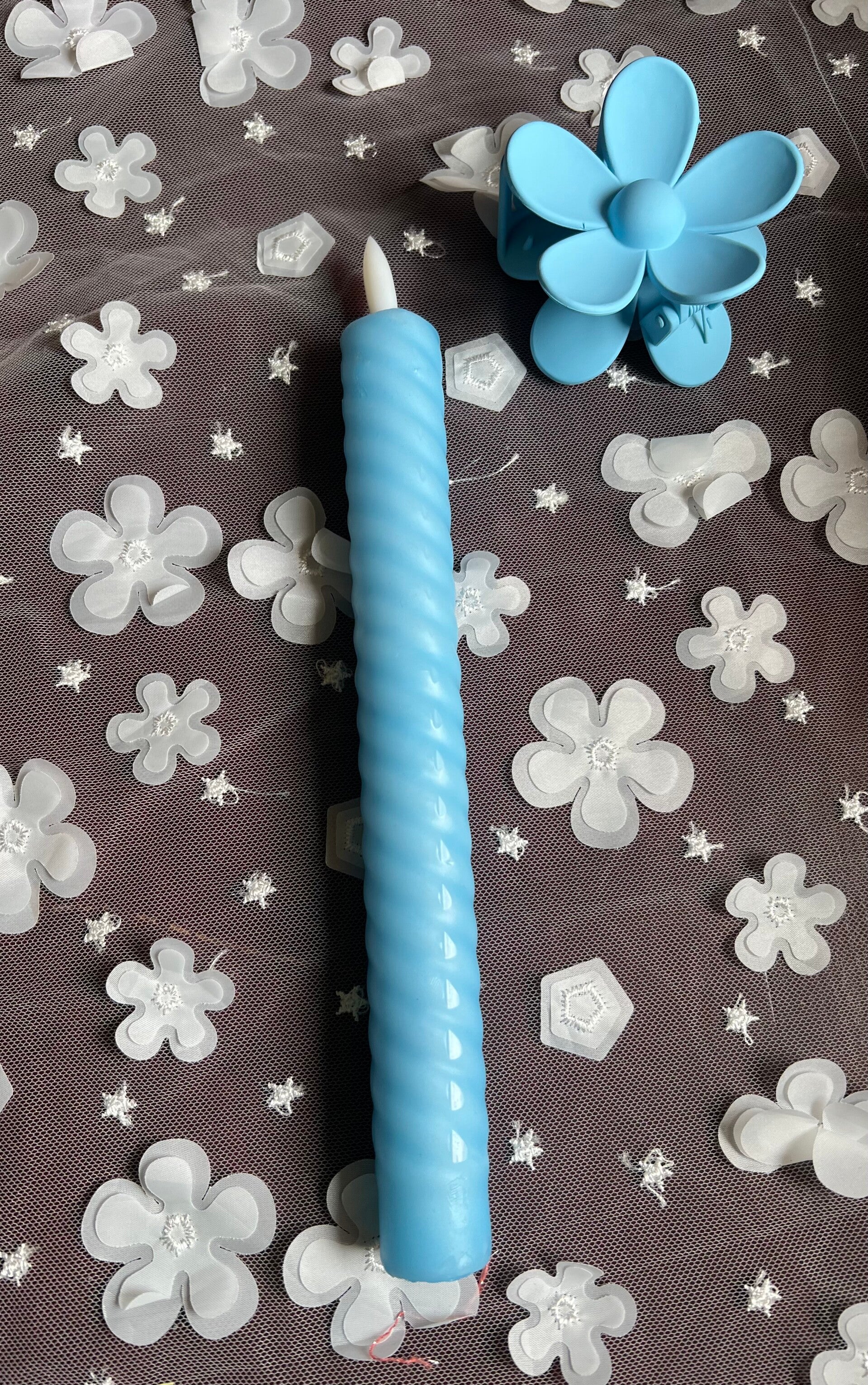 De kaars werkt op 2 AAA batterijen. Zie de laatste foto voor plaatsing van de batterijen en het aanzetten van de kaars.