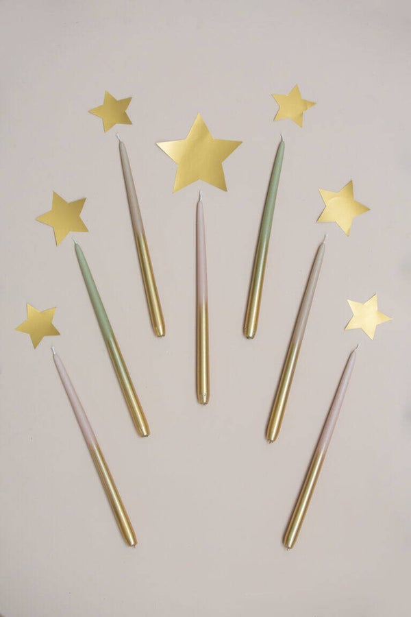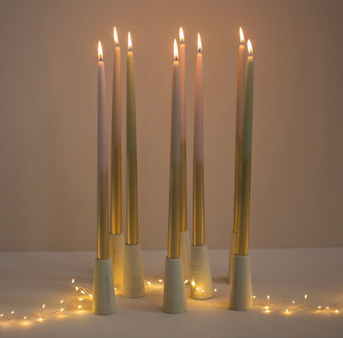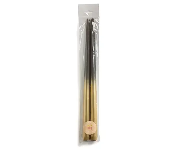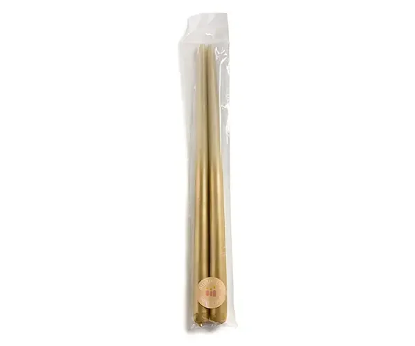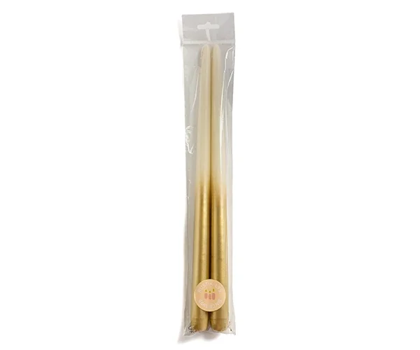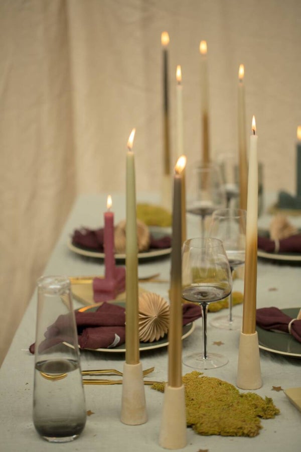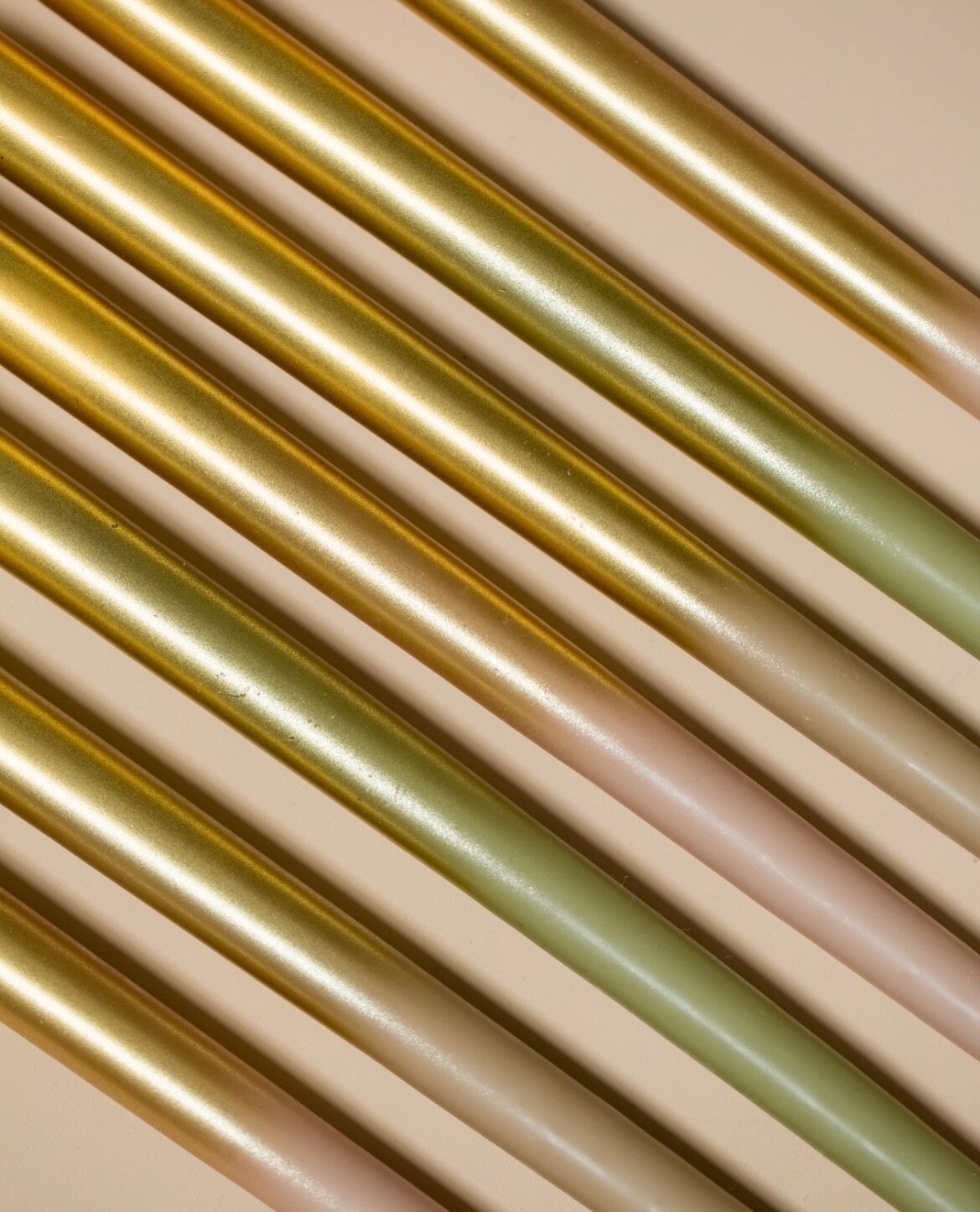 Deze tweelingkaarsen zijn met hun 38cm extra lang. Er is nog een goudspray toegevoegd tot halverwege de kaars voor een feestelijke touch. Net als een echte tweeling zijn ook deze kaarsen onafscheidelijk en worden daarom alleen per set van twee verkocht. Verkrijgbaar in de kleuren vanilla, pistache, warmgrijs, eucalyptus en nude.