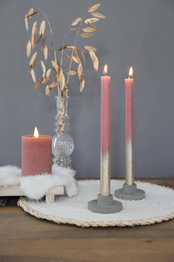 Deze dinerkaarsen hebben een mooi goudlaagje aan de onderkant. Perfect dus voor de feestmaand december. Verkrijgbaar in de kleuren creme, mosgroen (donker), eucalyptus groen (licht), bordeaux, mauve en wit. Afmeting: Ø2,1 x 25 cm