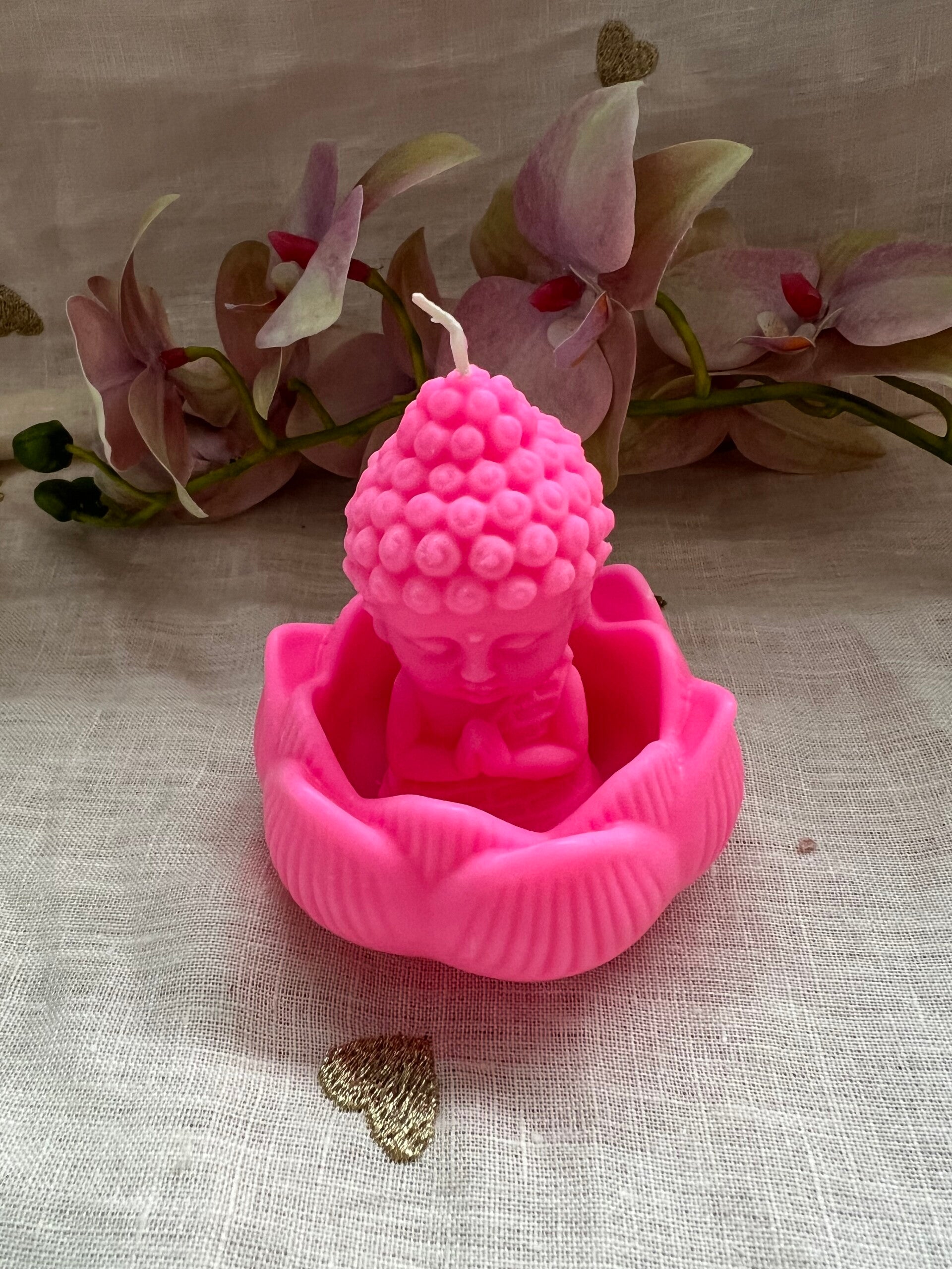 De kaars bestaat uit 2 delen. Een buddha en een Lotusbloem. De Buddha heeft een lont en wordt in de lotusbloem gezet.