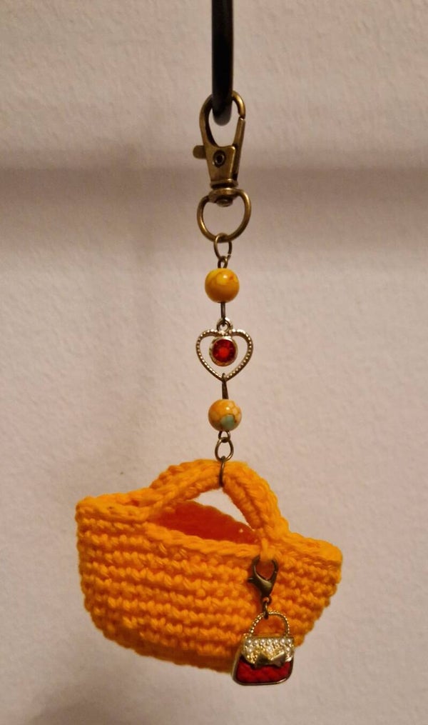 Een tasje aan je tas met deze sleutelhanger. Het tasje is 6 cm lang en 7 cm breed. Met hanger is de lengte 13 cm.
