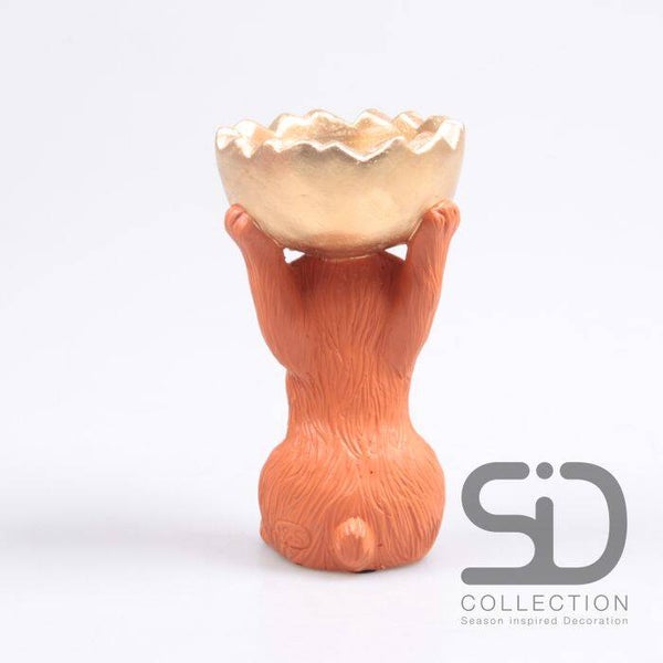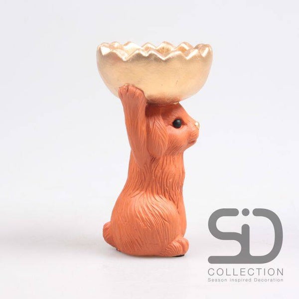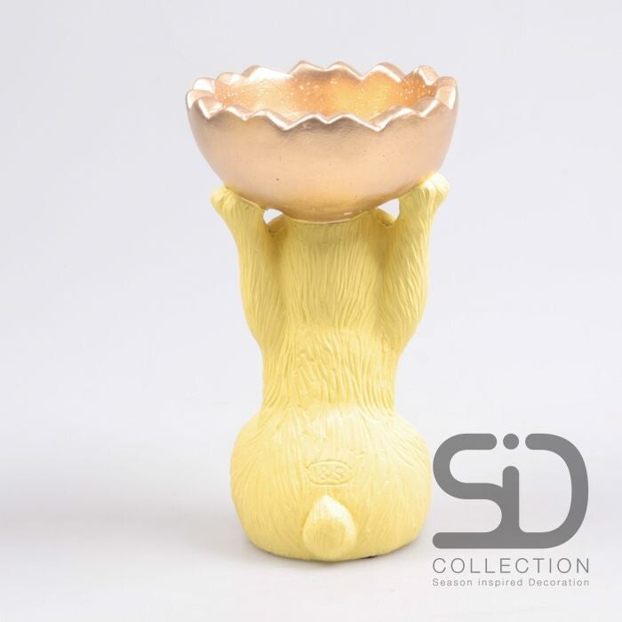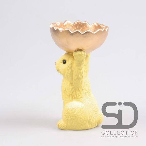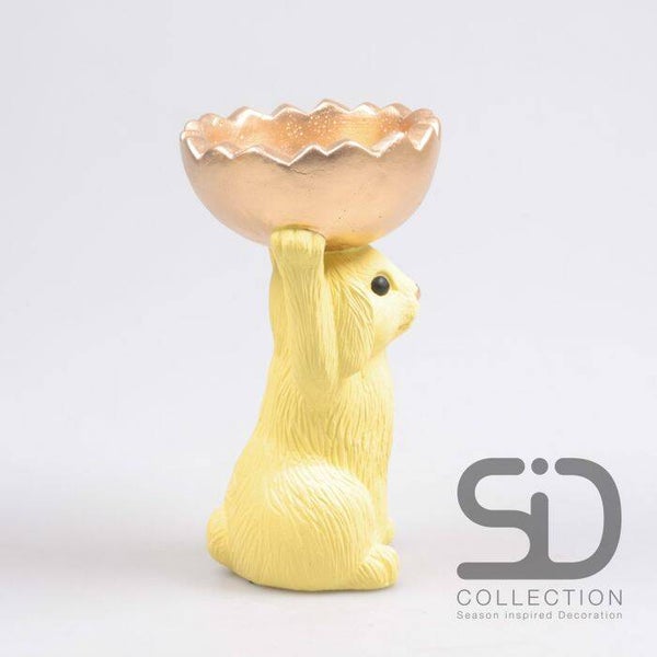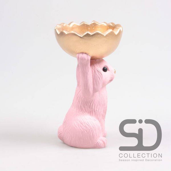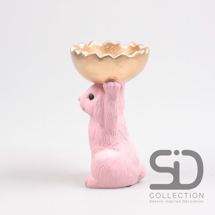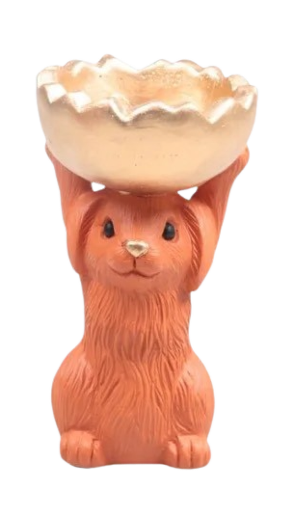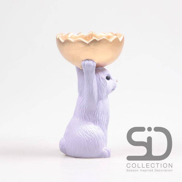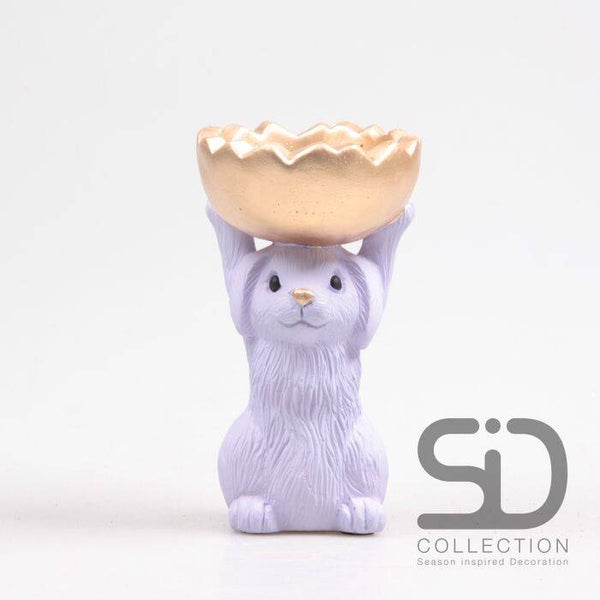 Deze paashaas houdt een schaaltje vast waar je bijv. de chocolade eitjes in kunt doen. Leuk voor op de brunchtafel met Pasen, of in de huiskamer rond Pasen. Verkrijgbaar in 4 kleuren.