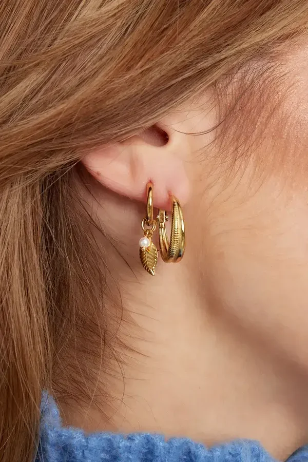 Ben jij net als ik helemaal verliefd op de bedeltjes trend? Shop dan snel deze te schattige gouden oorbellen met bedel in de vorm van een blaadje met leuke pareltjes. Super schattig en daarnaast mega trendy! Je kunt deze oorbellen perfect stylen met meerdere sieraden met pareltjes; superleuk voor een leuk feestje. De oorbellen zijn gemaakt van stainless steel, parels en steentjes en hebben een afmeting van 2,8 cm. Ideaal voor een leuke statement look.