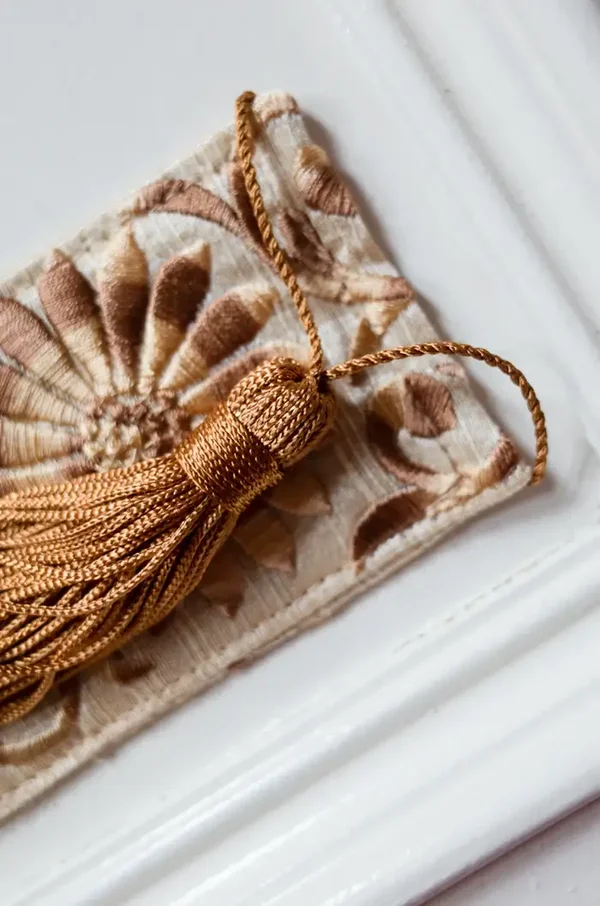 De stoffen boekenleggers bestaan voor 50 % uit geborduurd zijde en voor 50% uit katoen.