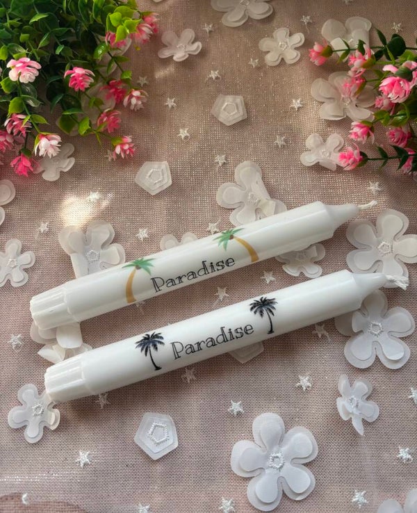 Kaars met zwarte tekst 'paradise' en zwarte palmbomen.