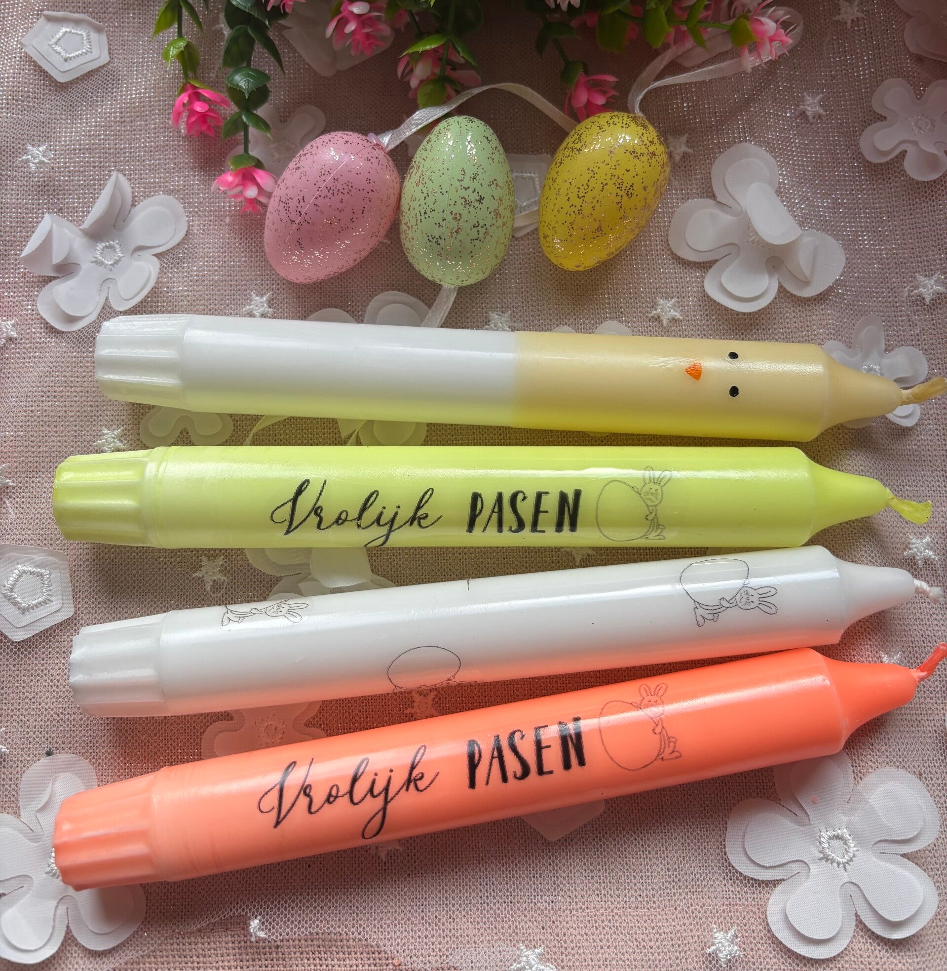 Kaars met zwarte tekst 'Vrolijk Pasen'.