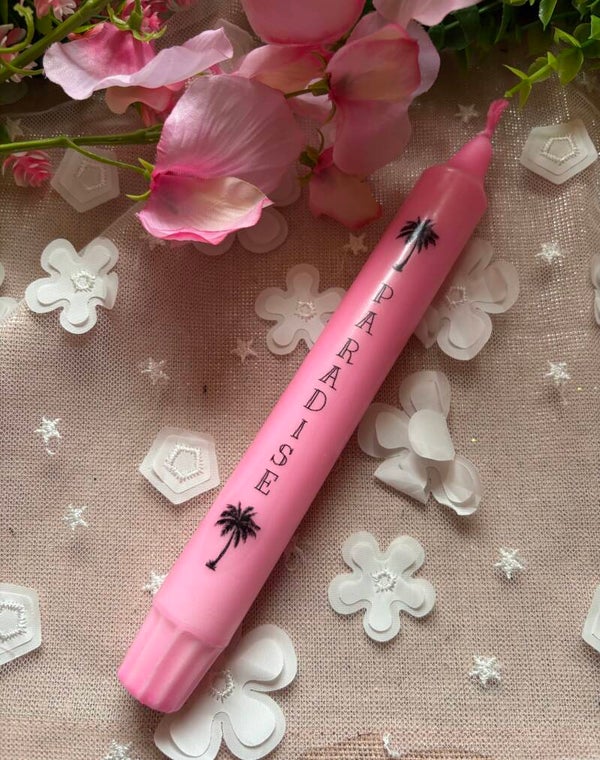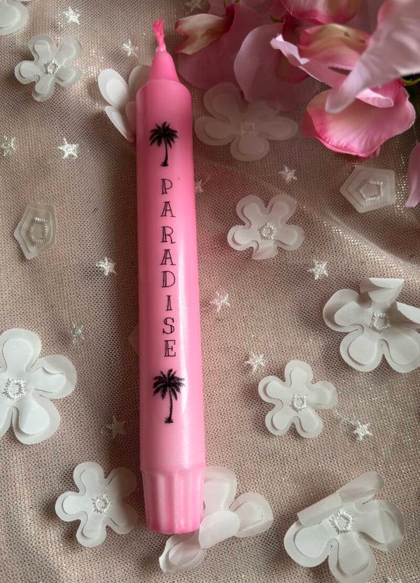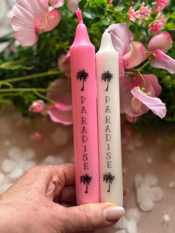 Kaars met zwarte tekst 'paradise' en zwarte palmbomen, verticaal geprint.