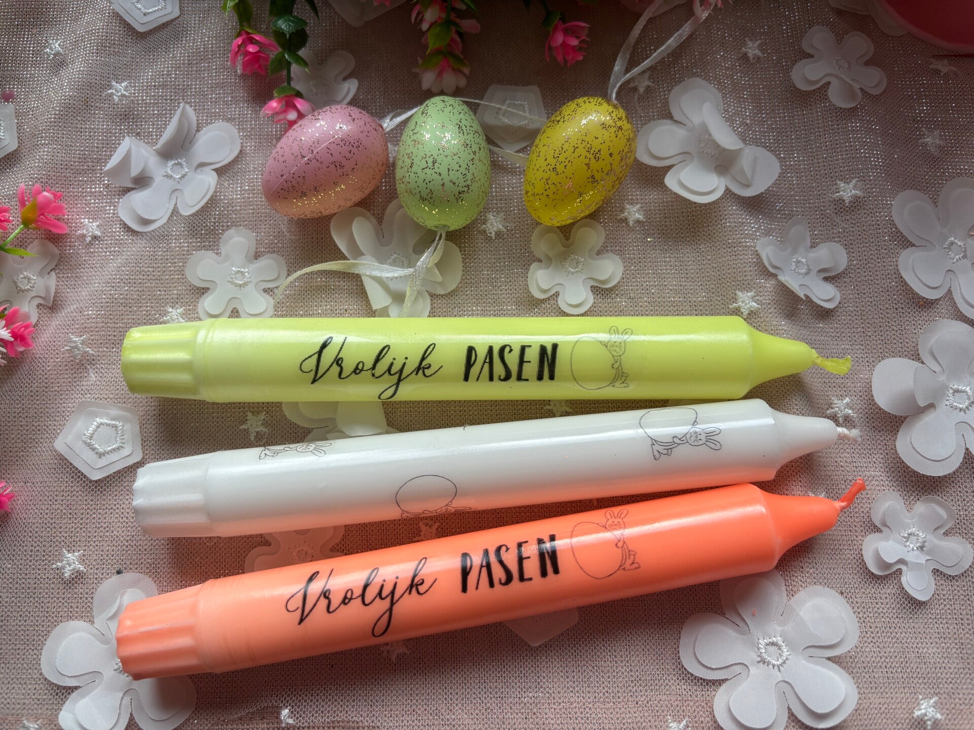 Kaars met rondom de paashaas met een eitje.