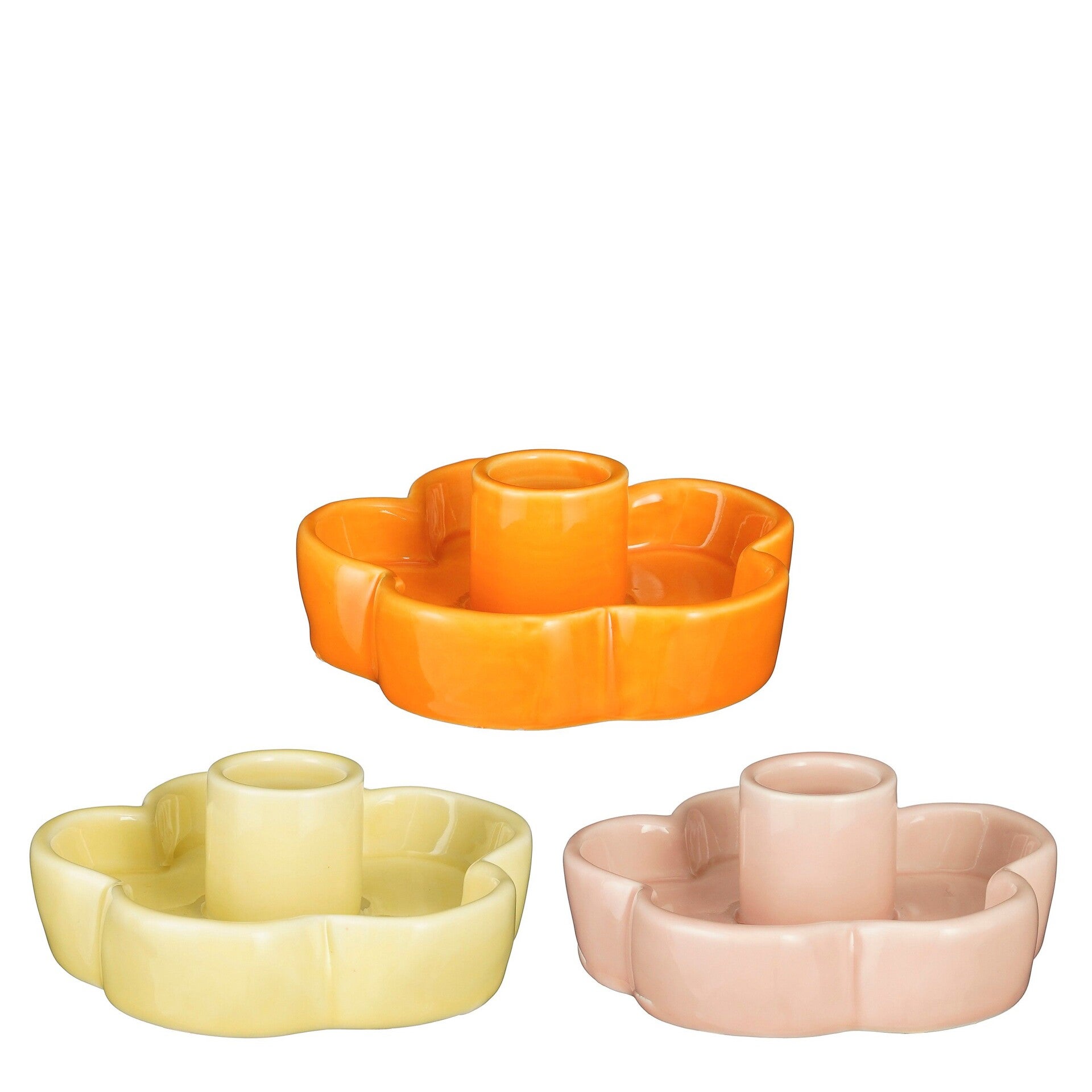 Vrolijk gekleurde stenen kaarsenhouders voor de lente en de zomer. Verkrijgbaar in 3 kleuren: oranje, geel en roze. Afmeting: H4 x D9 cm.