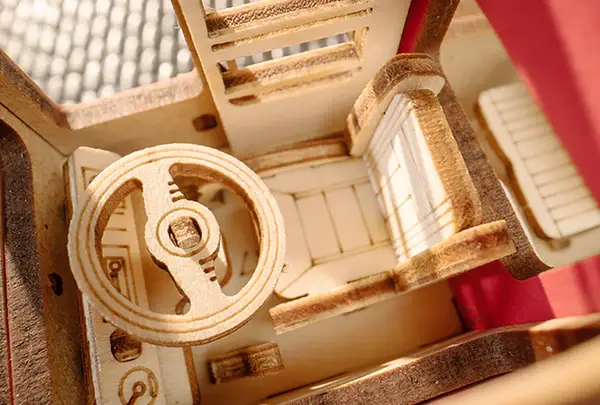 Dat is helemaal geen probleem, want je nieuwe dubbeldekker is al rood geschilderd als hij bij je thuiskomt in de mooie cadeaudoos. Dus je hoeft niet te klodderen met verf, wel zo praktisch. Wel zitten alle 245 puzzelstukken van dit bouwpakket voor volwassenen en kinderen vanaf 14 jaar, nog in hun 5 houten mallen. Deze elementen druk je met je vingers uit het hout. Zonder gereedschap zet je het in elkaar met pen-en-gatverindingen en je hebt meestal niet eens lijm nodig. Het hout kun je rondbuigen doordat het bewerkt is met speciale laserinkepingen. Aan jou de eer!