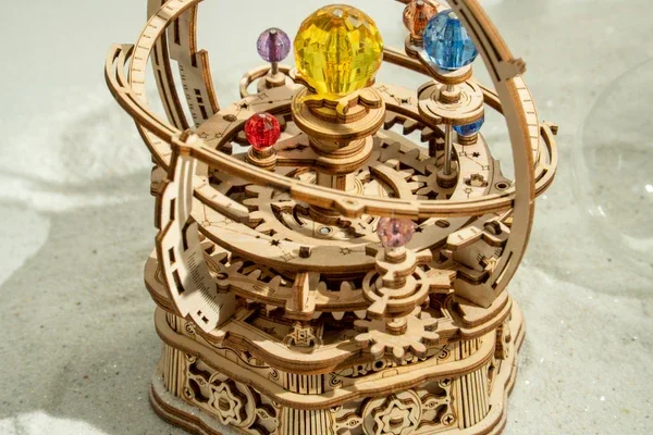 Raadsel: het maakt geluid, het draait rond en je maakt het zelf. Wat is dat? Dát is de Starry Night. Een ROKR bouwpakket van hout van een planetarium. Het heeft een vintage-uitstraling en is bijzonder mooi gedetailleerd. Dit Orrery planetarium stelt ons eigen zonnestelsel voor. Je kunt zelf de kleuren van de flonkerende kralen kiezen voor de planeten. Als je dit miniatuur bouwpakket opwindt, gaan de planeten draaien en hoor je klinkklaar van Barbara Streisand ‘Memory’ uit de musical ‘Cats’.