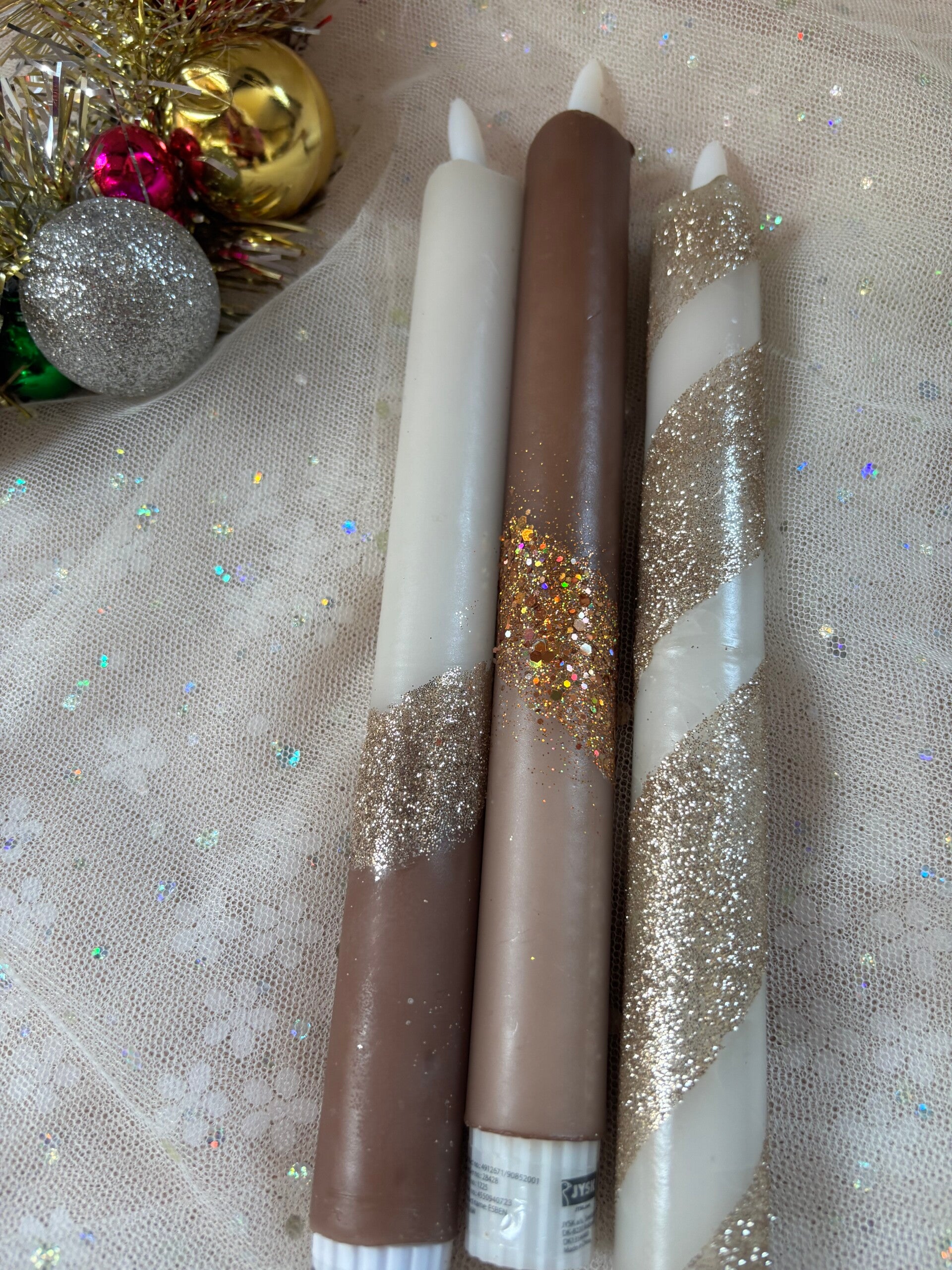De LED kaarsen versieren wij met gouden glitter. Hoe gezellig staan deze kaarsen straks bij jou in de huiskamer.