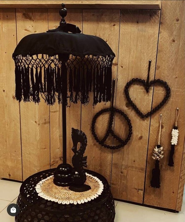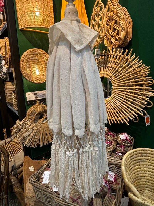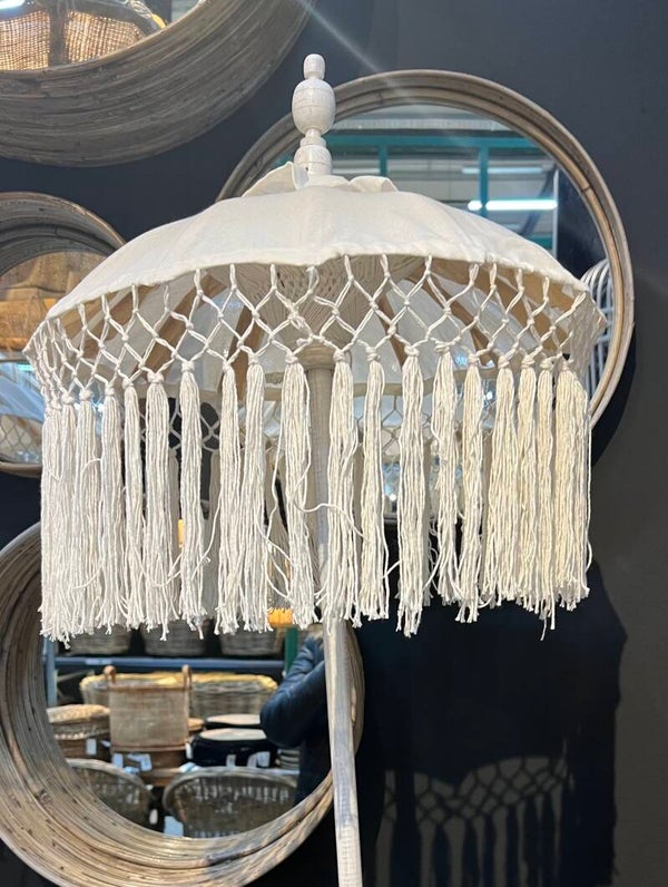 Handgemaakt en gedecoreerd met een haakwerk van katoen met franjes. Het binnenwerk bestaat uit een kunstzinnig vlechtwerk van geweven katoen. De baleinen zijn van bamboestroken. De tafelparasol heeft een diameter van 50 cm, hoogte 90 cm.
