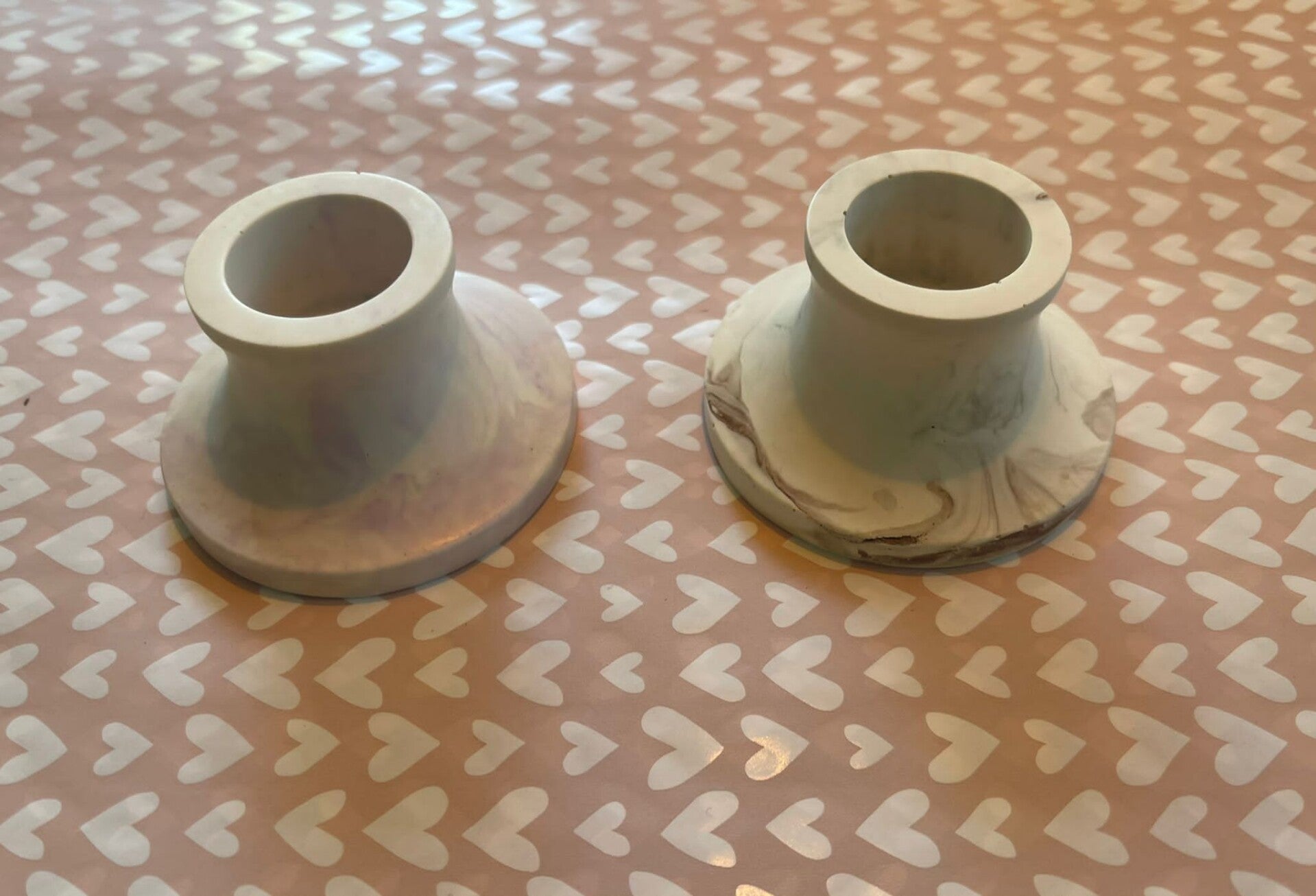 Deze kandelaar is handgemaakt met jesmoniet en pigment. Elk stuk is handgemaakt, geschuurd en gelakt. Het patroon en de hier en daar kleine onvolkomenheden maakt elke kandelaar tot een uniek item.