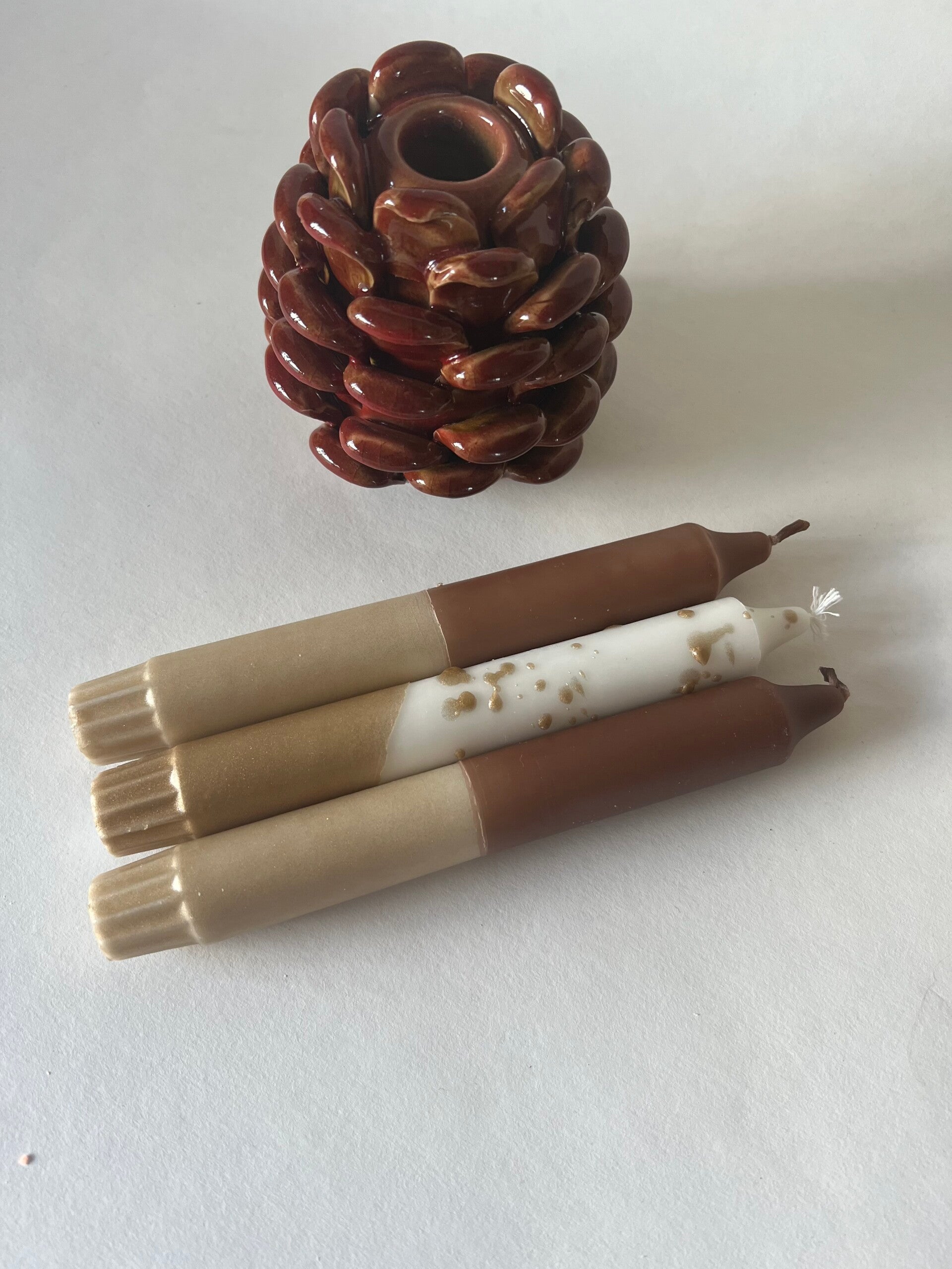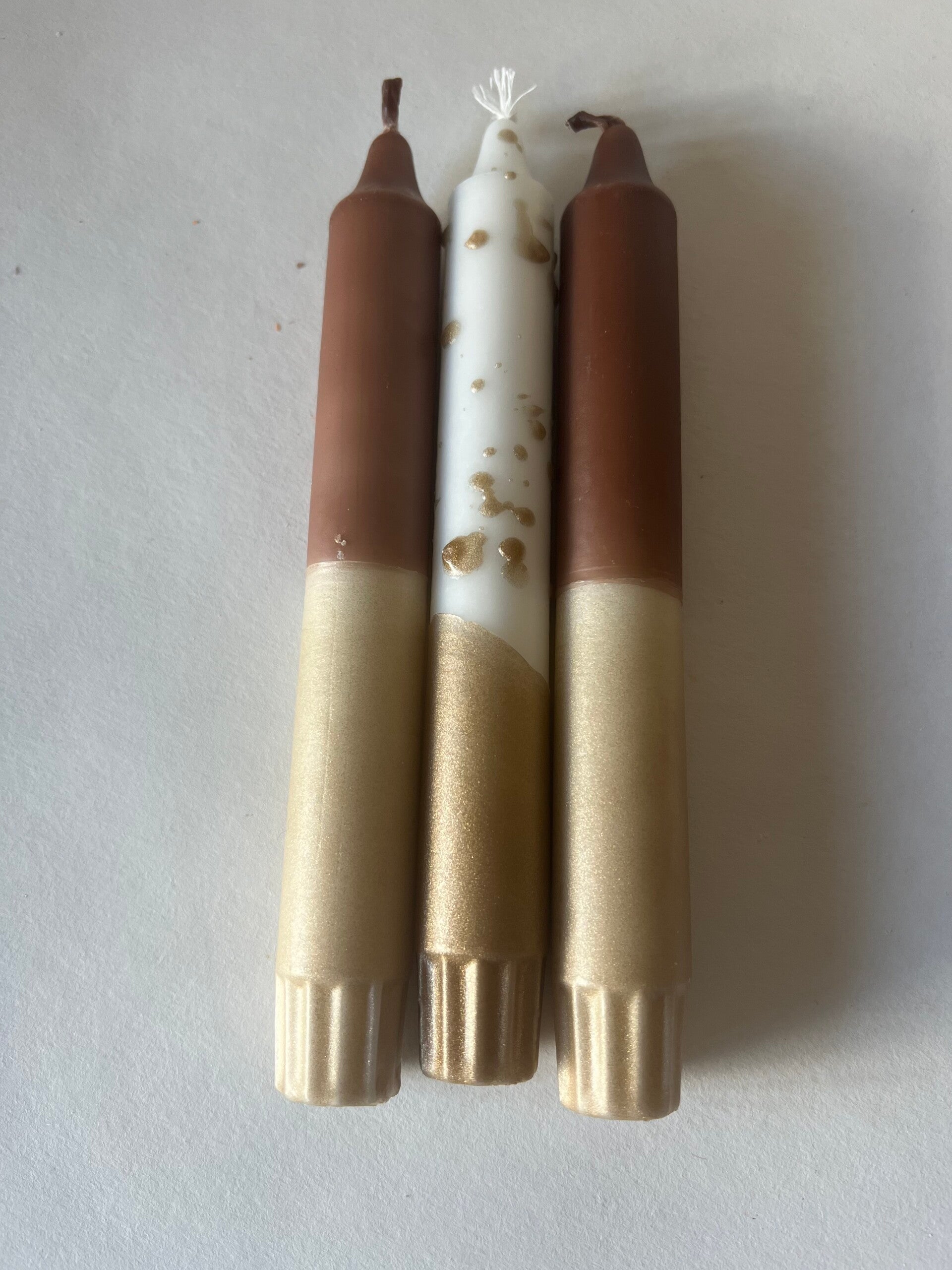 Deze set van 3 kaarsen heeft een warme uitstraling door de combinatie van bruin en goud.