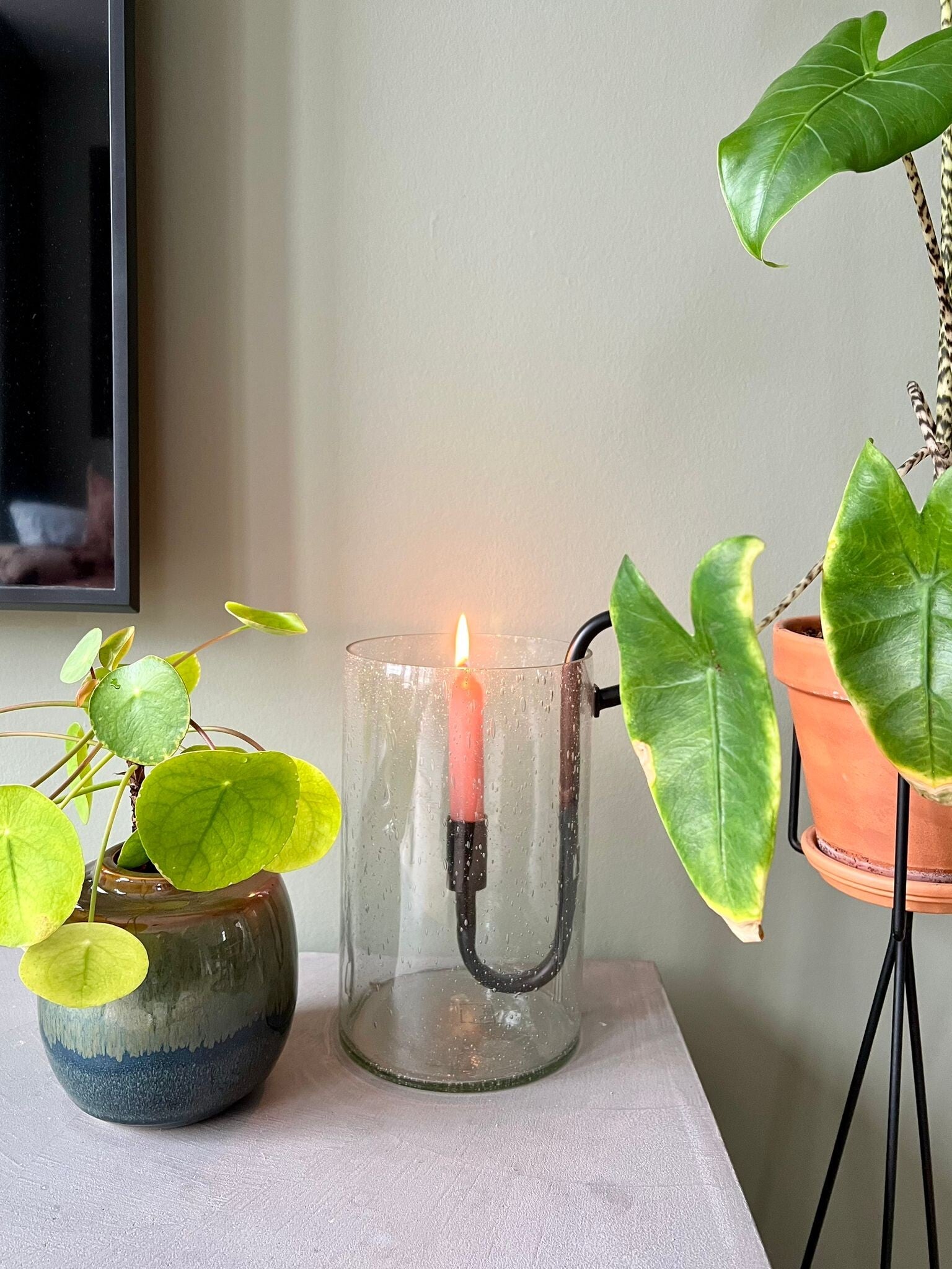 Kaarshouder Cas bestaat uit een mooie glazen vaas en een metalen kaarsenhouder. Hang de kaarsenhouder met een klein kaarsje in de vaas en geniet van een relaxmomentje. Stoer en stijlvol genieten!