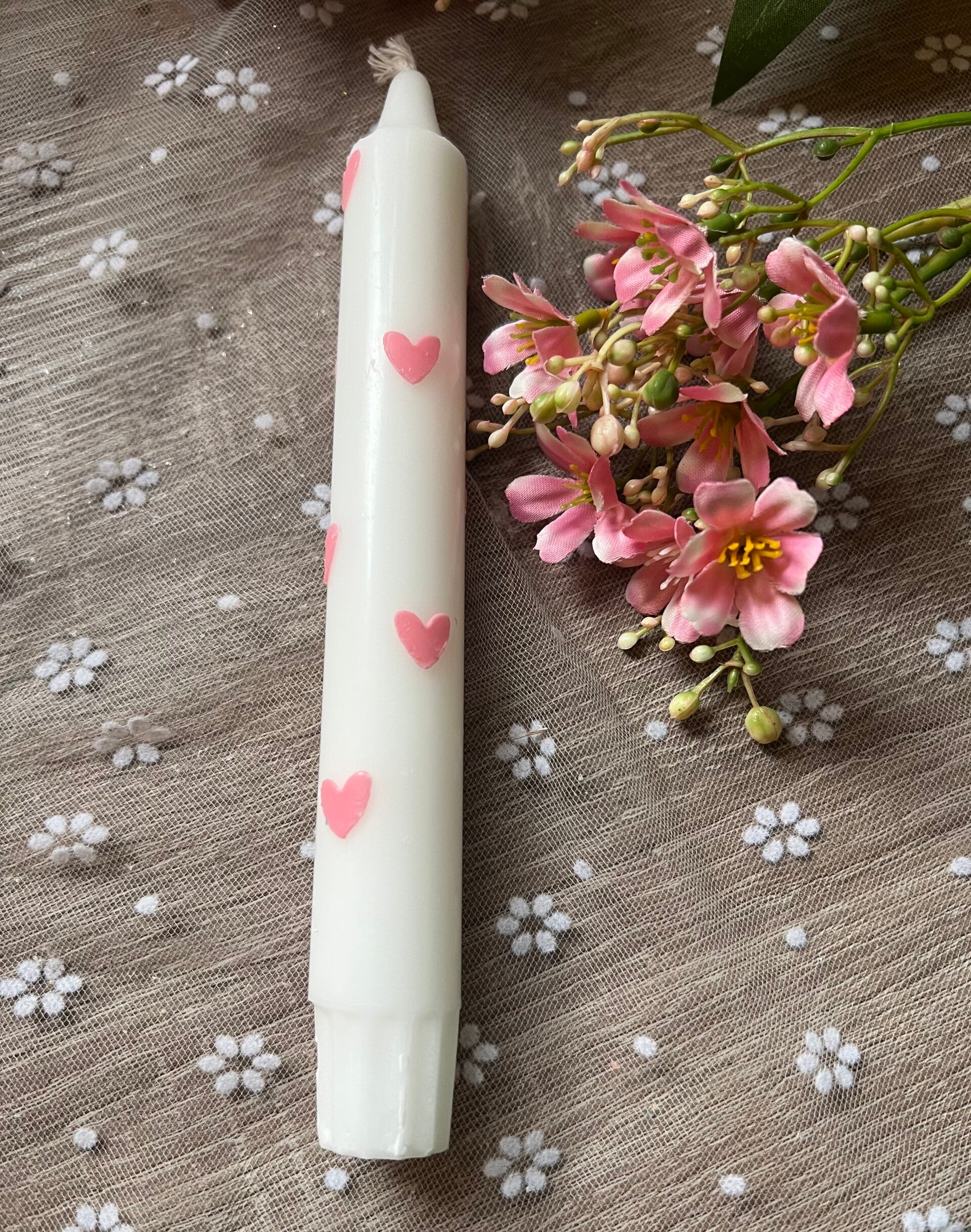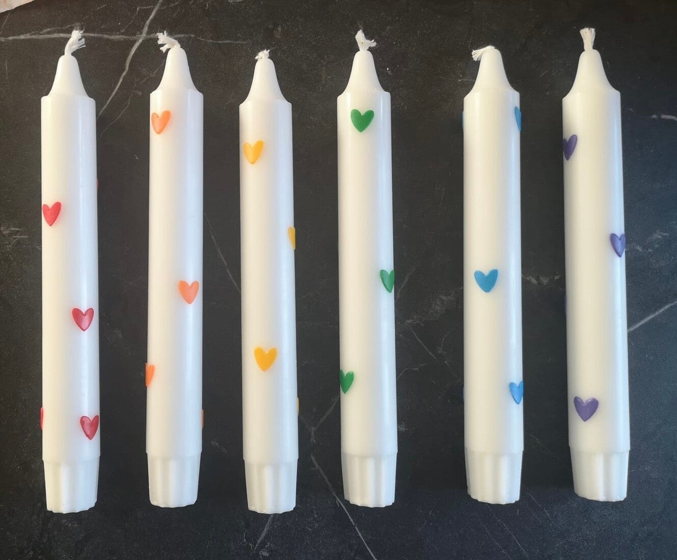 Deze kaarsen hebben we voorzien van heel veel hartjes van wax. De hartjes zijn handgemaakt. Hoe gezellig staan deze kaarsen straks bij jou in de huiskamer. Indien gewenst kunnen we de kaars eerst nog in een andere kleur dippen. En ook de hartjes kunnen we in elke gewenste kleur maken. Geef dit ajb aan in het opmerkingen veld als je gaat afrekenen.