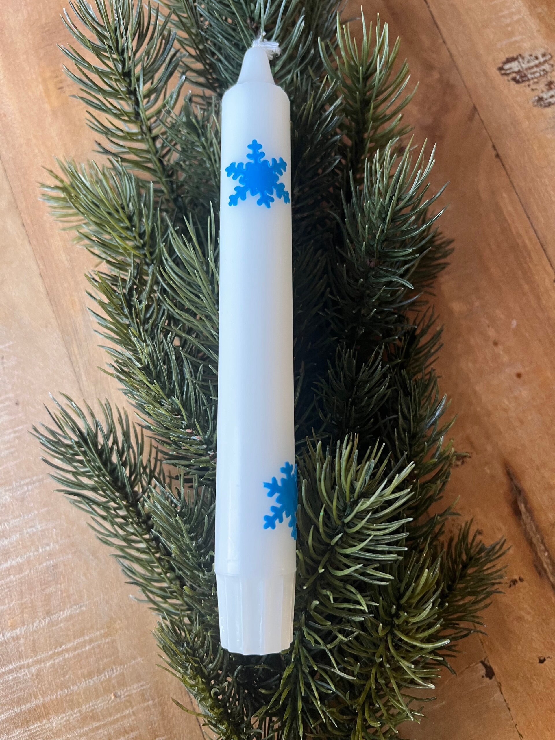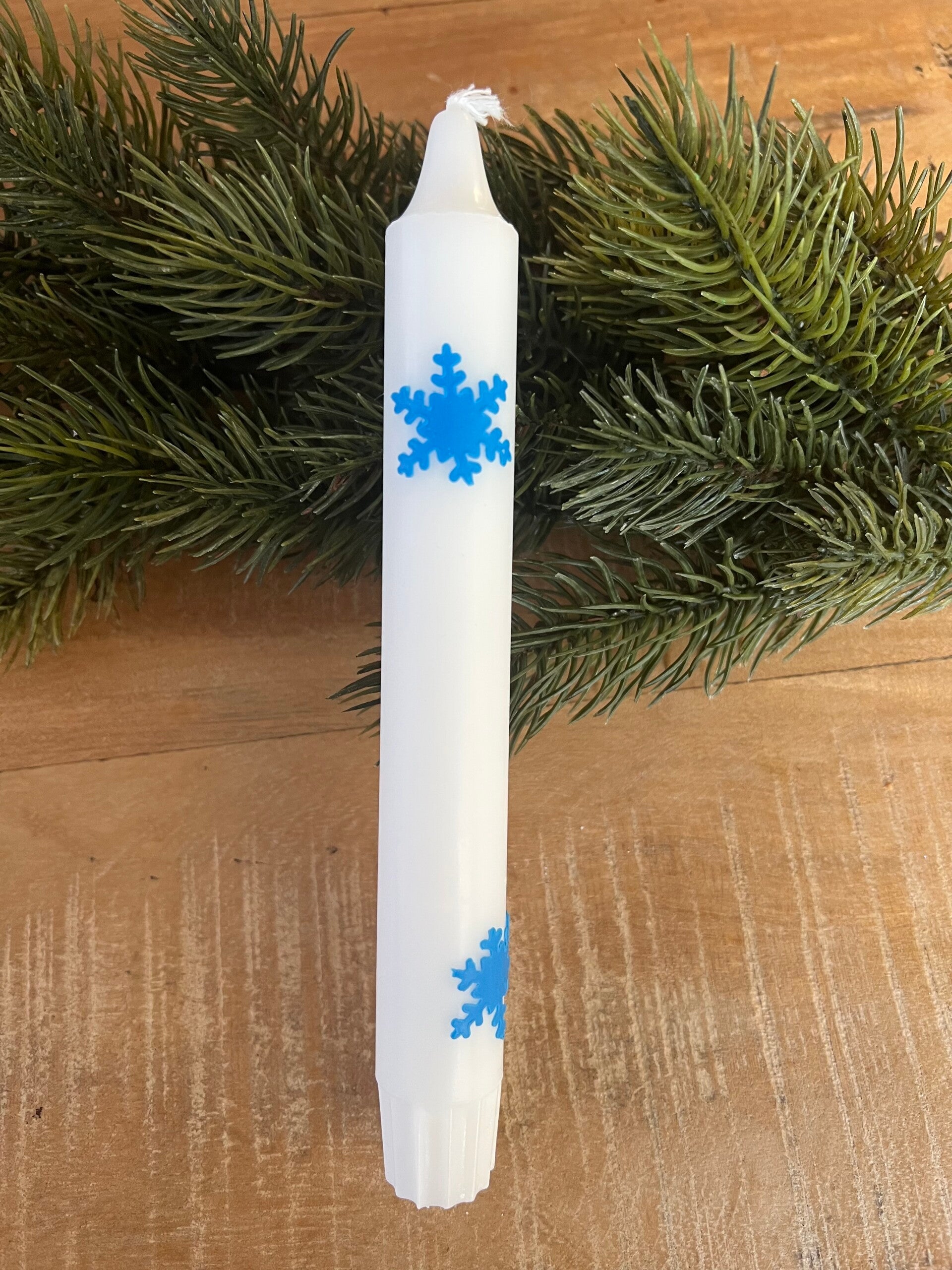 Deze kaarsen hebben we voorzien van een aantal sneeuwvlokken van wax. De sneeuwvlokken zijn handgemaakt. Hoe gezellig staan deze kaarsen straks bij jou op de kersttafel. Indien gewenst kunnen we de kaars eerst nog in een andere kleur dippen en de sneeuwvlok (bijv. wit) een andere kleur geven. Geef dit ajb aan in het opmerkingen veld als je gaat afrekenen.