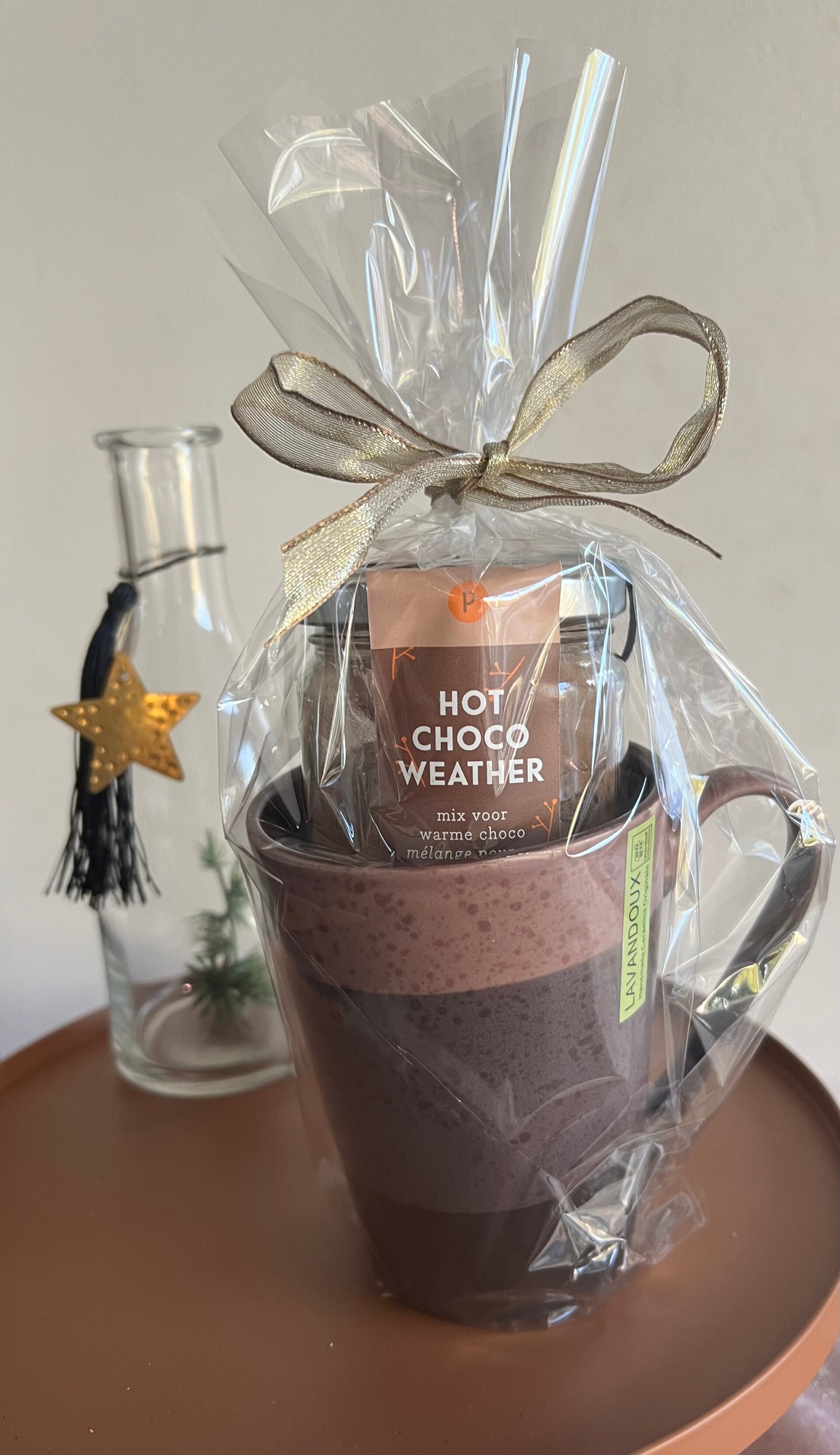 Dit kadopakket bestaat uit een mok met een mix van Pineut warme chocolade (hot choco weather).