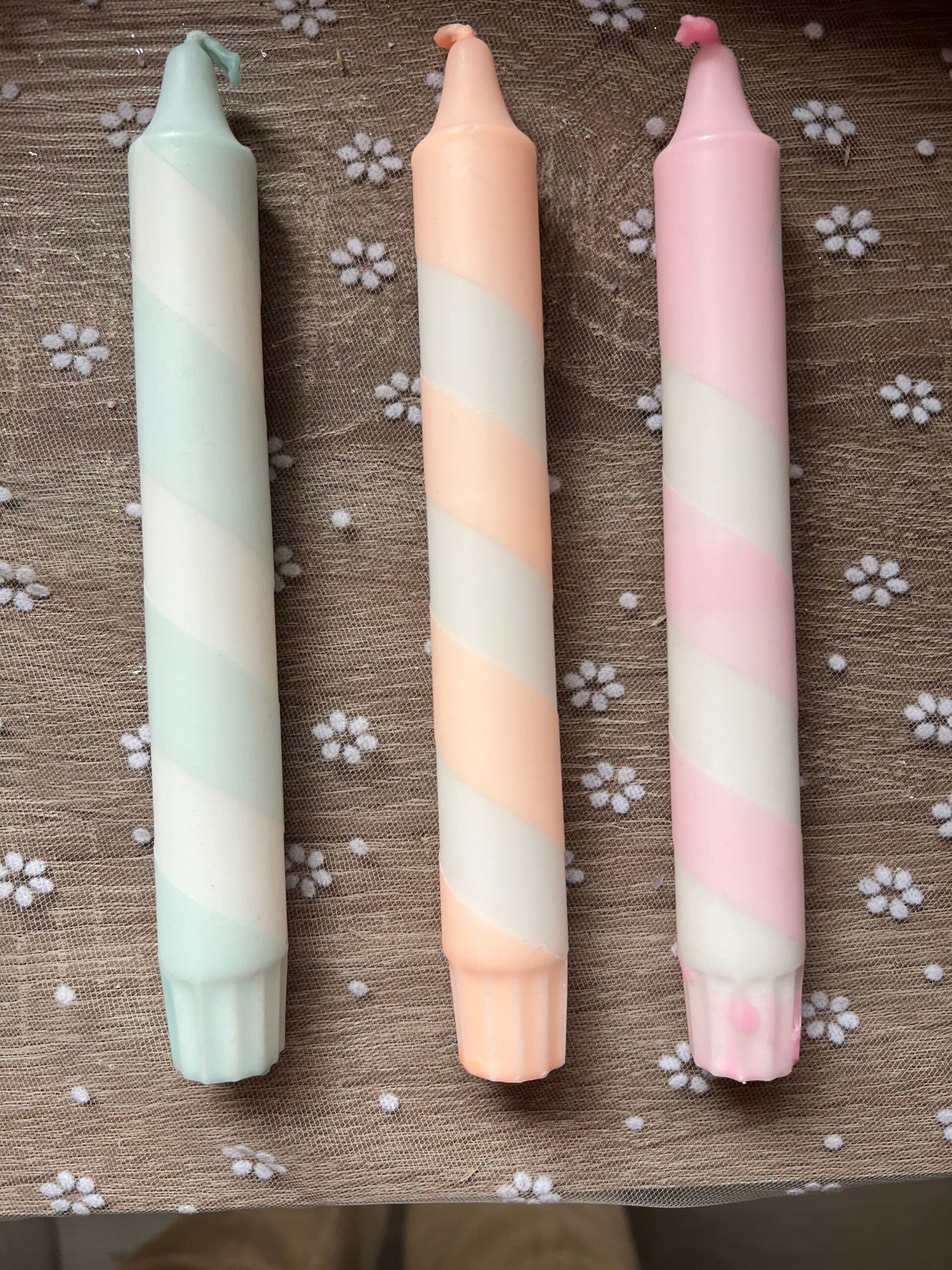 Door deze witte kaarsen loopt een gekleurd streepje. We hebben een aantal kleuren op voorraad, maar zoals je van ons gewend bent maken we de swirls in elke gewenste kleur.