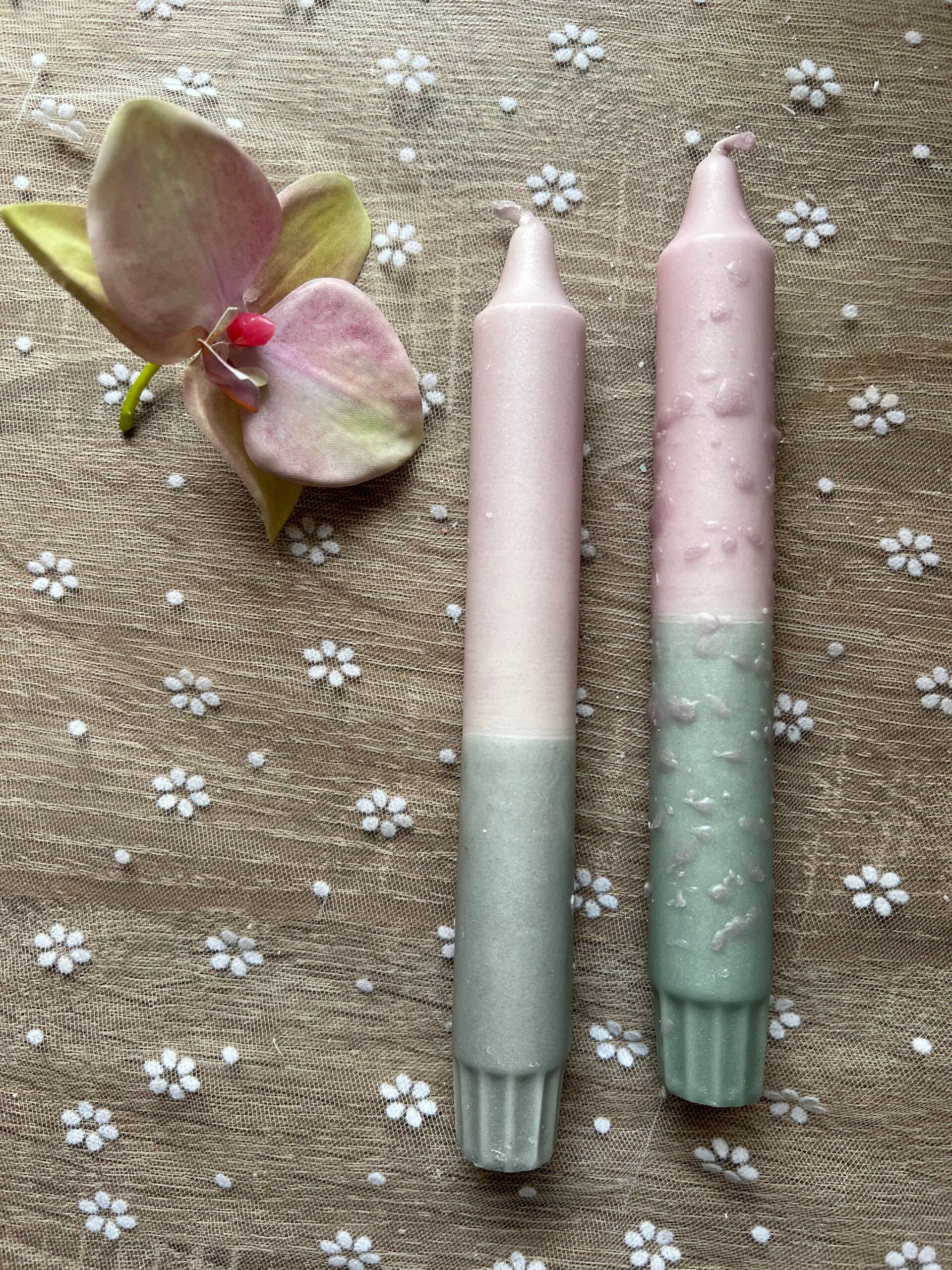 Leuke set van 2 dipkaarsen in de kleuren roze en zilver.