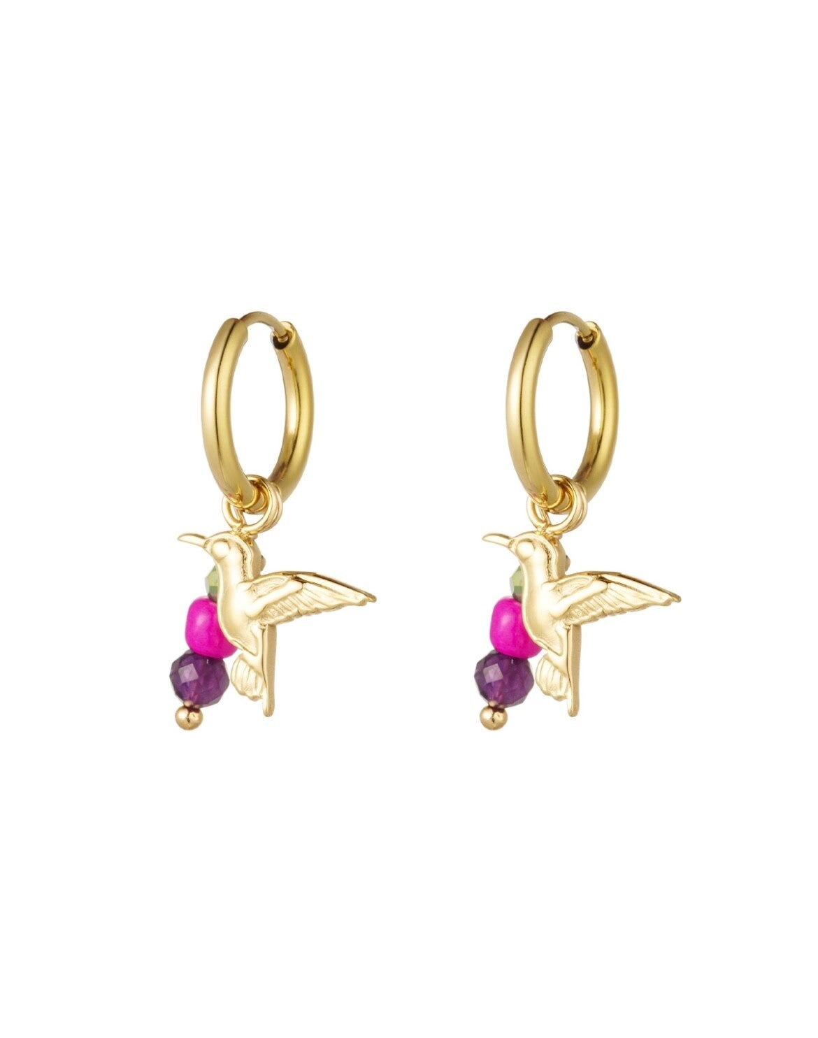 Hoe leuk zijn deze oorbellen met kolibrie bedel en steentjes. Een echte toevoeging aan jouw ear party. De oorbellen zijn gemaakt van stainless steel, steentjes, hermatiet en glas. De oorbellen zijn 2,5 cm lang.