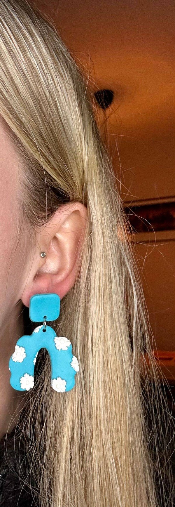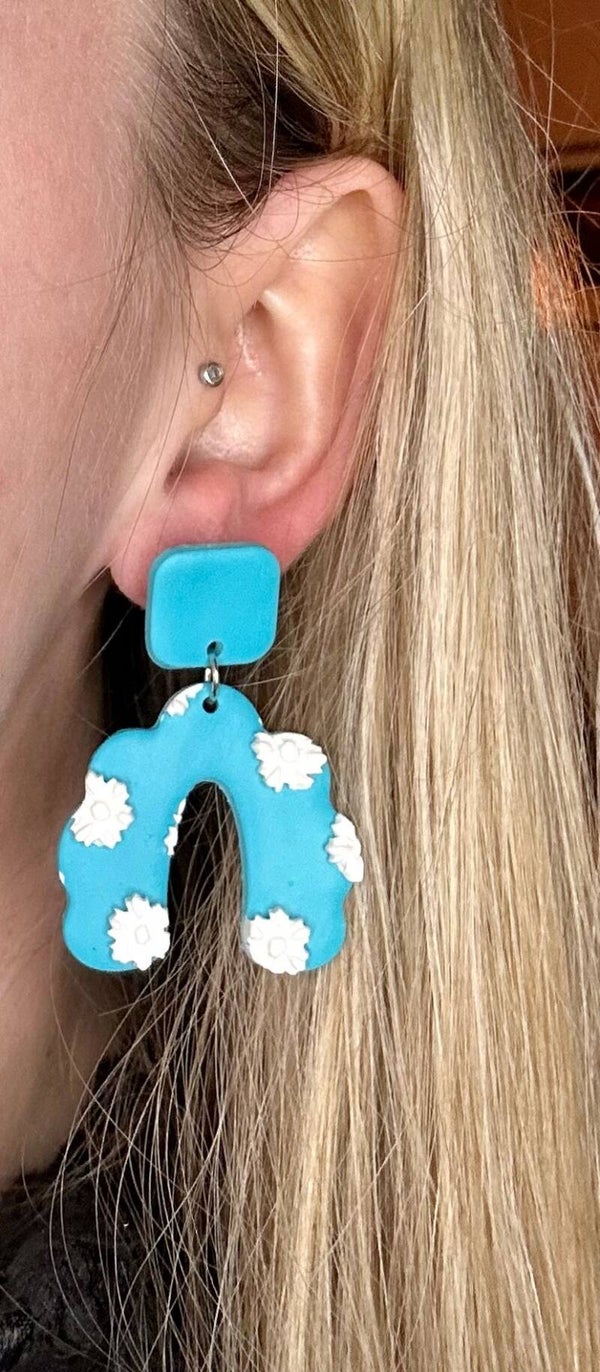 Handgemaakte oorbellen van polymeer klei in N-vorm afgewerkt met margrietjes. De oorbellen zijn van nickle free metal. Het voordeel van polymeer klei: de oorbellen zijn echt super licht! Elk paar is handgemaakt en daardoor uniek. Omdat de oorbellen per stuk worden gemaakt kan het zijn dat de oorbel iets afwijkt van de foto.